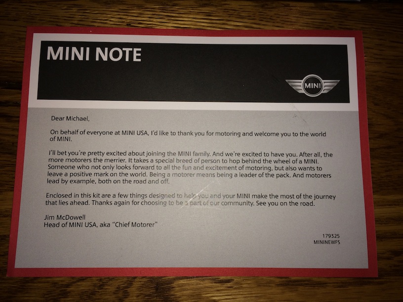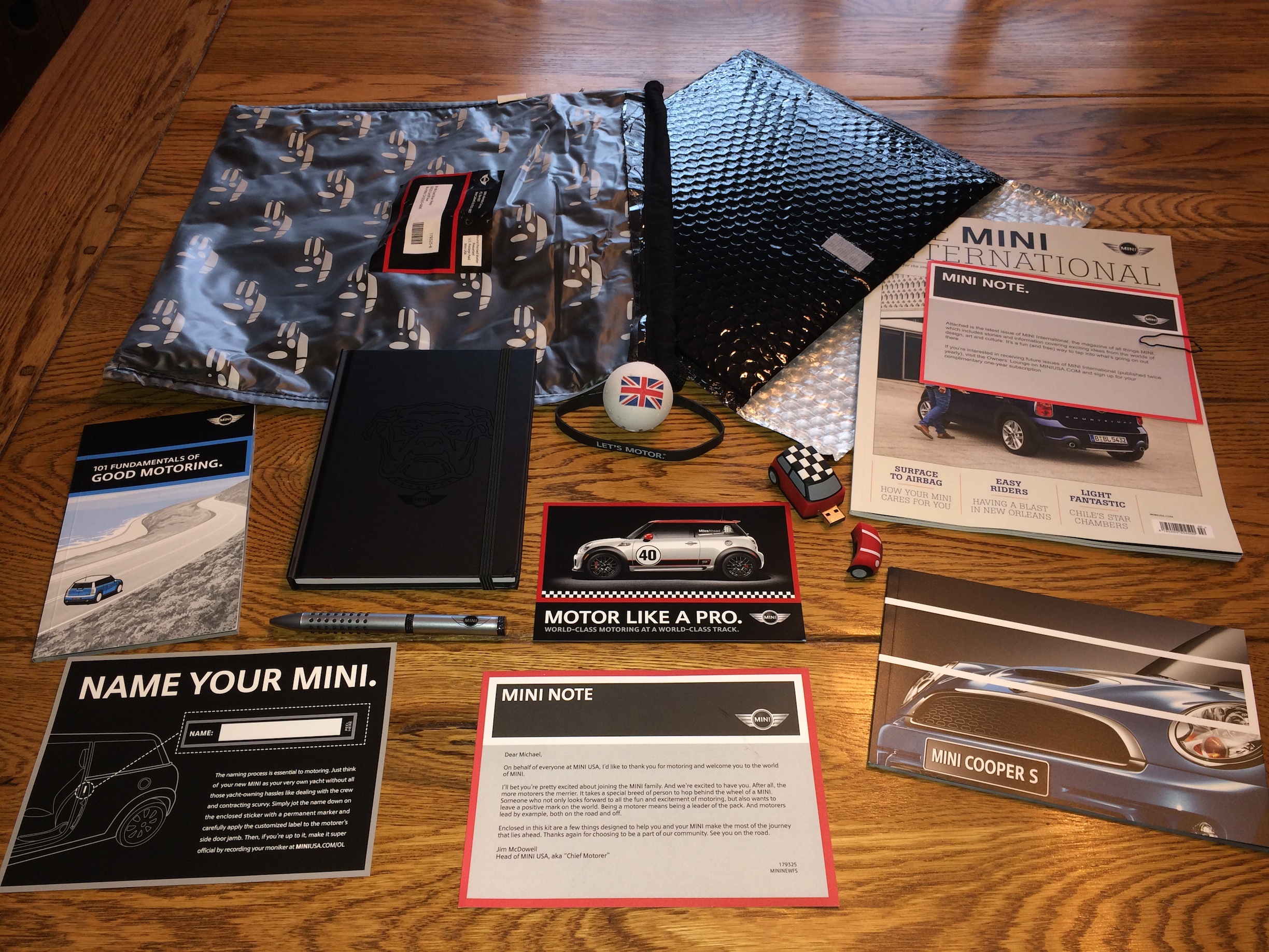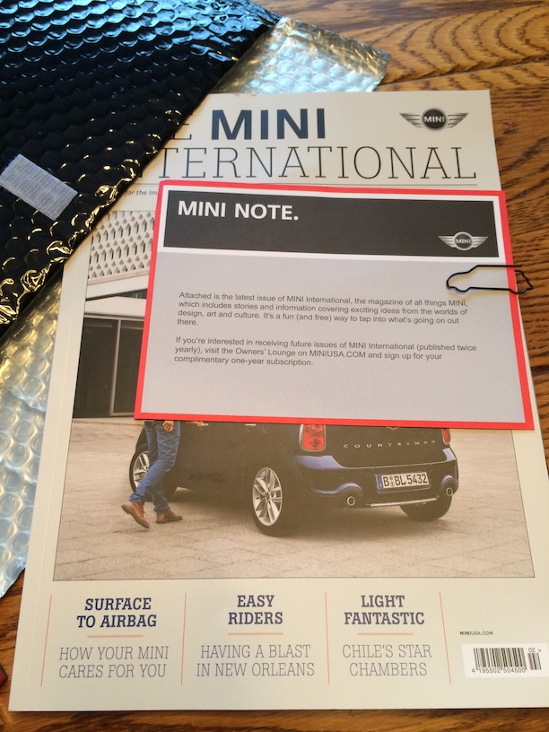 I received in the mail yesterday a most interesting package. It was a collection of items from MINI USA as a result of me recently joining the family of MINI owners. It was unexpected as I certainly don’t recall asking for any sort of gift.